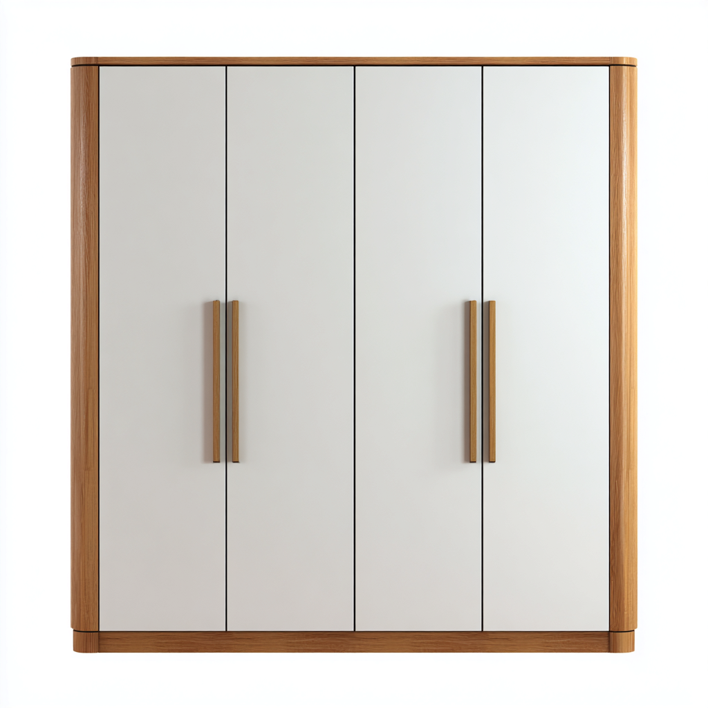 Armadio a 4 ante progettato per l'arredo della camera da letto, caratterizzato da un equilibrio visivo tra superfici chiare e dettagli in finitura naturale. Le proporzioni compatte lo rendono adatto a spazi domestici ordinati e luminosi, mantenendo un aspetto essenziale e contemporaneo.