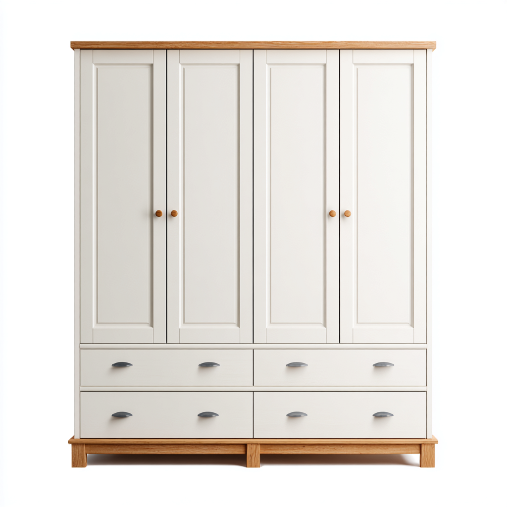 Armadio a 4 ante pensato per l'arredo della camera da letto, caratterizzato da uno stile equilibrato che unisce superfici chiare a dettagli in legno naturale. Le linee pulite e la finitura luminosa contribuiscono a creare un ambiente ordinato e accogliente.