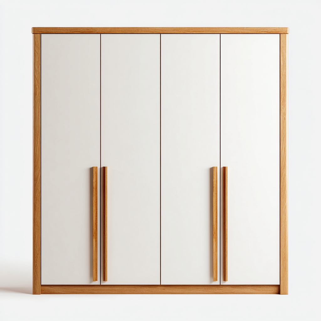 Armadio a 4 ante progettato per ambienti domestici contemporanei, con una combinazione cromatica equilibrata che unisce superfici chiare a dettagli in finitura naturale. La struttura ampia consente una gestione ordinata dello spazio dedicato all'abbigliamento, mantenendo un aspetto pulito e accogliente.