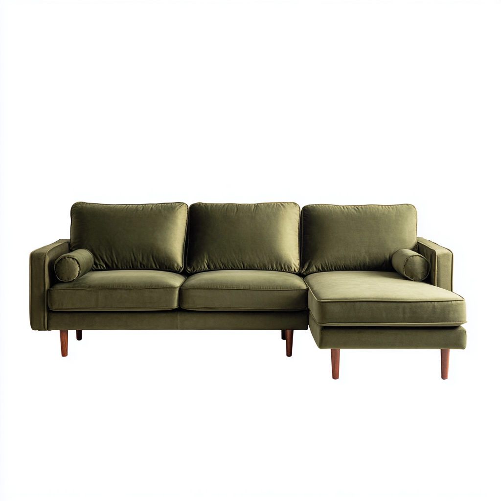 Rivestimento in tessuto vellutato di colore verde oliva con finitura morbida e uniforme. La struttura interna garantisce solidità e durata, mentre l'imbottitura assicura una seduta confortevole nel tempo.