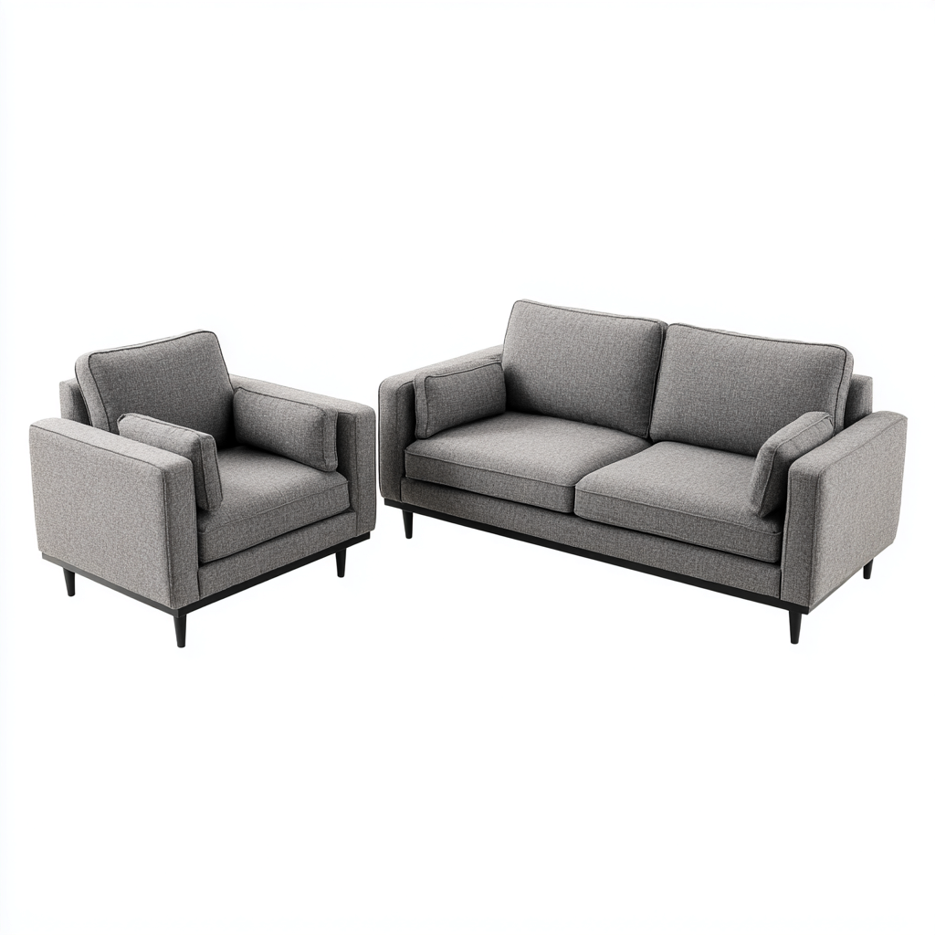 Questo set di divani è progettato per arredare il soggiorno con uno stile moderno ed equilibrato. La composizione include un divano e una poltrona, ideali per creare un ambiente ordinato e funzionale per l'uso quotidiano.